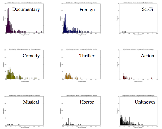 Decay rates by movie type show large variation: Documentary and Foreign films are sharply peaked near lambda ~ 0.4, others are more spread out.